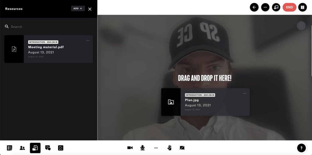 To show material in a meeting, you will first upload the material into Resources – either ahead of time or during the meeting. You will then be able to drag and drop material onto stage, placing it in the center of participants’ attention. As host, you can drag and drop resources during any given agenda activity, while participants can only drag and drop during a Team Activity.
