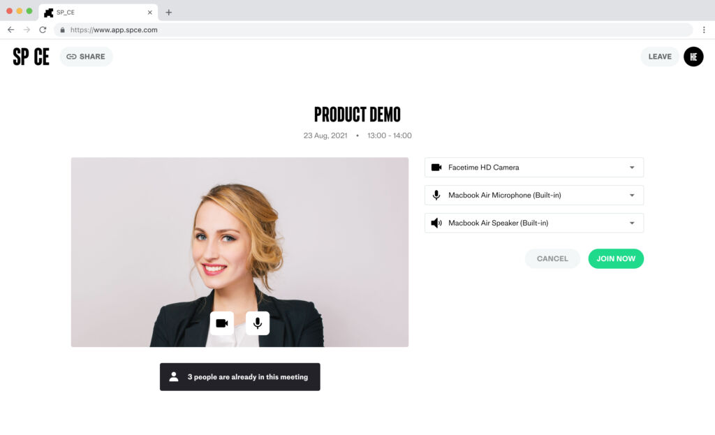 To start a meeting, simply go to your space – where you will be able to see your meeting in the timeline. Well there, you click on the JOIN button on the meeting you want to start. This will open a popover where you can preview your video and click JOIN NOW to go to the meeting.