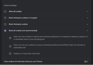 To see if your browser is blocking cookies, you can go to your browser settings (as seen below for Google Chrome).