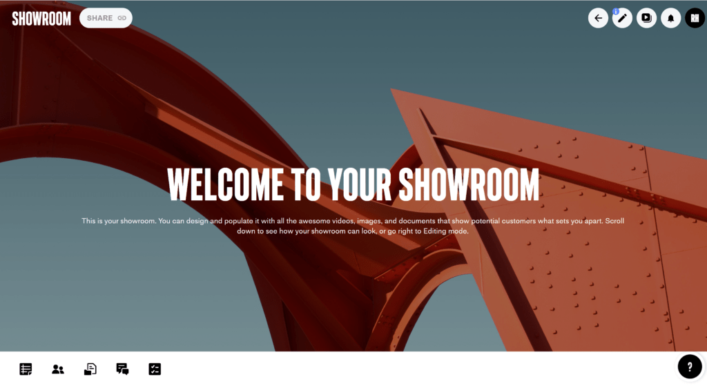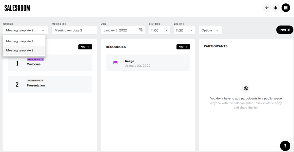 A showroom space is optimized to be shared with multiple opportunities, and has limited functionality. This means that participants won’t be able to see other participants in the space, that they will not be able to add resources and will not see or be able to add to-do activities. As a host, you will still have all functions available to you.