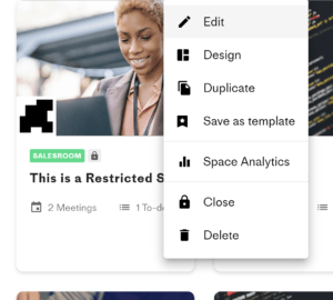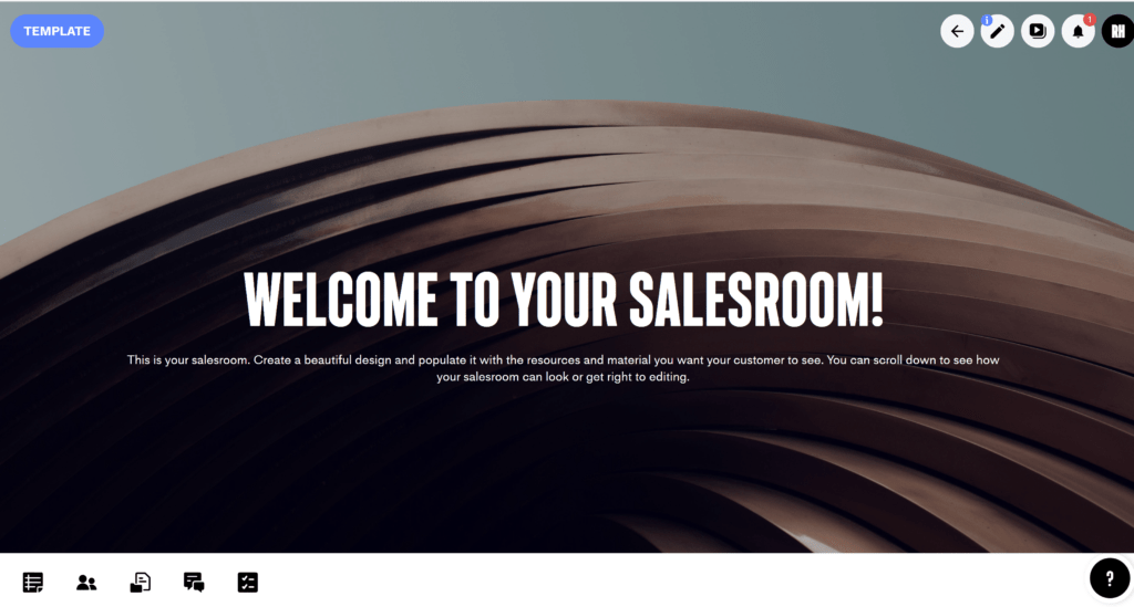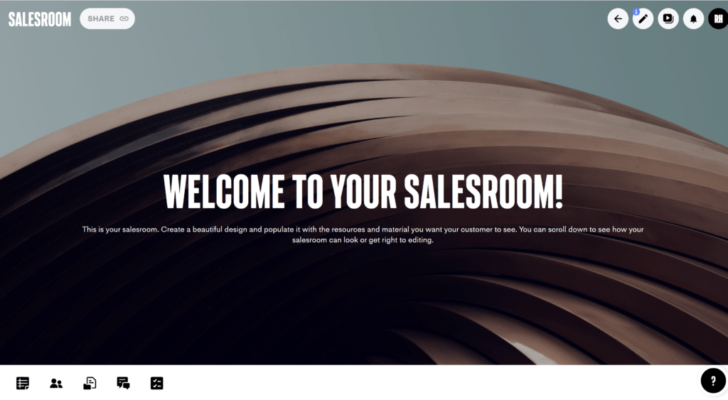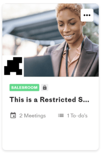 A salesroom space is optimized for collaboration with one opportunity. It has our full range of functionality, and is used to meet and interact with one organization, customer or prospect.