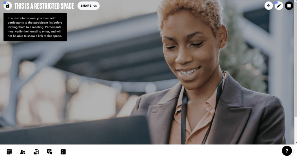 A restricted space is a locked space that only participants who’ve been added can enter. With that, it’s a more secure space to use when you don’t want anyone with the link to be able to enter (as is the case in a public space).