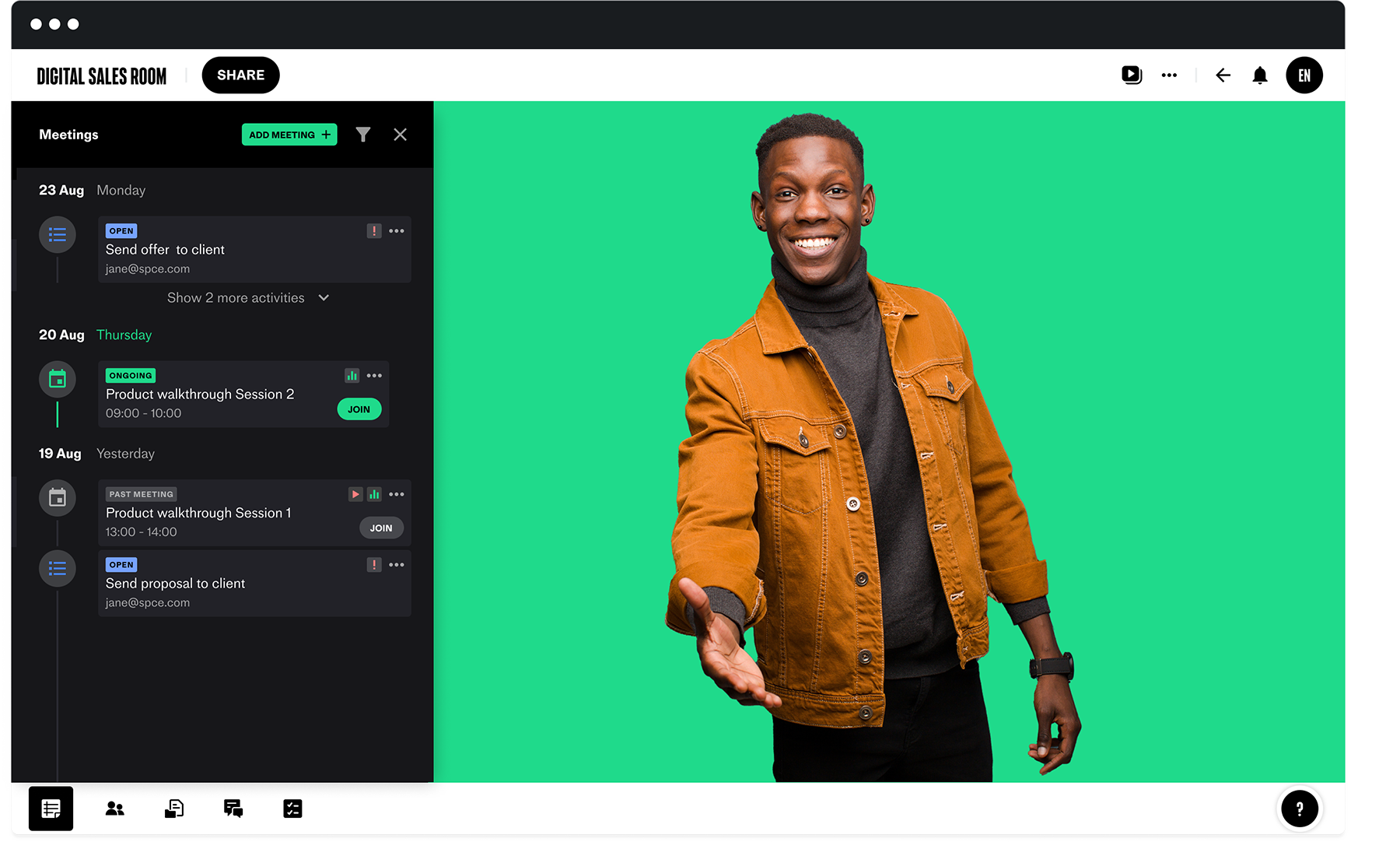Create a Digital Sales Room, invite your buyer or key account and start interacting. You and your buyers will always be able to see what meetings have been held, what activites need to get done and what is to happen next. If your buyer invites more stakeholders, you’ll be able to stay on top of exactly who has joined your Digital Sales Room, while the new stakeholders immidiately can get to know you and your product. With that, you’ll be able to control the sales process and stay on top your deals.